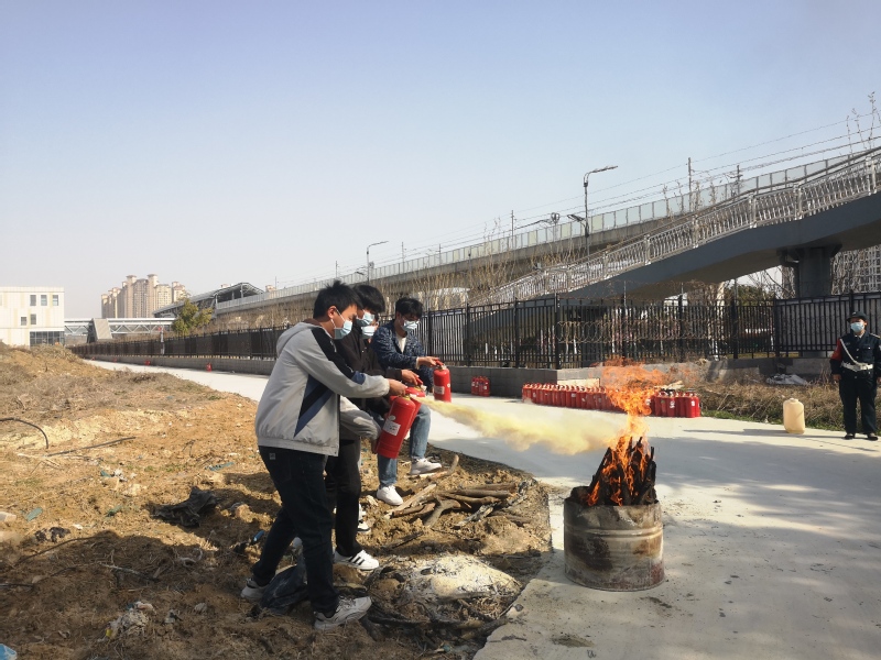 随后,保卫处工作人员详细讲解了消防防护装备穿戴与使用、灭火器的使用方法和注意事项,并进行了现场演示。在认真观摩后,同学们依次进行了灭火实操演练,面对熊熊燃烧的火堆,大家有序地按照灭火器的使用步骤,将浓烟大火迅速扑灭。通过灭火演练,提高了同学们对灭火器的使用熟练程度,增强了处置和扑救初起火灾的能力。