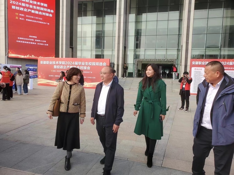 双选会现场人头攒动,氛围热烈。企业招聘人员与参会学生围绕企业文化、优势特色、行业前景、岗位职责、工作环境、福利待遇、晋升发展等情况双向互动,双方达成初步就业意向近400余人。期间,就业与创新创业指导中心、部分学院分别与宣城市、苏滁高新区管委会、长丰县人社部门带队人员以及校友企业负责人进行了校地、校企合作洽谈,就进一步强化校政企产教融合等深化了共识。