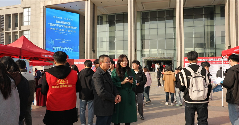 11月15日下午,amjs澳金沙门线路首页2024届毕业生校园双选会暨校政企产教融合对接会在风华广场举办。院党委书记李方泽,院党委委员、副院长宣岩松,宣城市人社局、苏滁高新区管委会、长丰县人社局相关负责人,学院就业与创新创业指导中心、教务处负责人,各二级学院党政负责人、教研室主任、毕业班辅导员、就业指导课教师等人员参加活动。