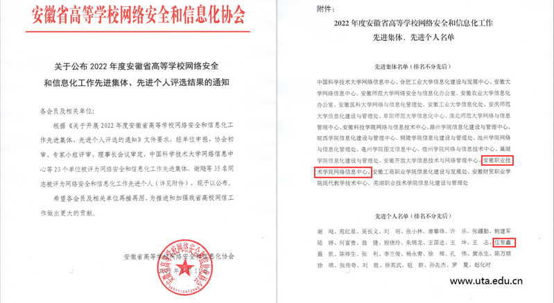 本网讯(网络信息中心通讯员 伍智鑫)近日,安徽省高等学校网络安全和信息化协会发布《关于公布2022年度安徽省高等学校网络安全和信息化工作先进集体、先进个人评选结果的通知》,经过层层推荐和专家评审,学院荣获2022年度网络安全和信息化工作先进集体,网络信息中心工作人员伍智鑫被评为先进个人。