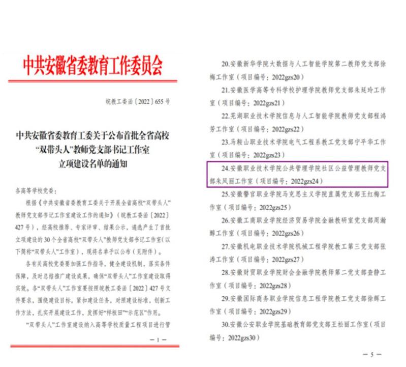 本网讯(党委组织部通讯员姜楠 朱凤丽)近日,中共安徽省委教育工委公布了首批全省高校“双带头人”教师党支部书记工作室立项建设名单,amjs澳金沙门线路首页公共管理学院社区公益管理教师党支部成功获批立项。这是amjs澳金沙门线路首页实施“一体两翼”办学架构,积极推进职教本科创建,以党建引领事业高质量发展的又一重要成果。