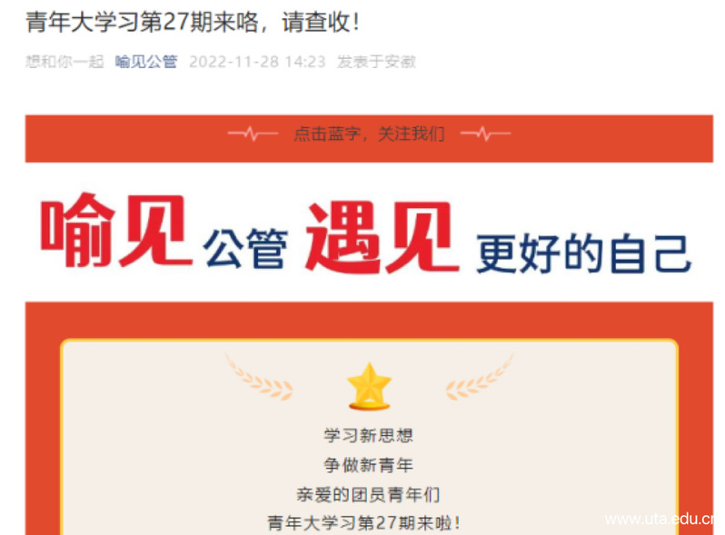 同时通过“喻见公管”公众号平台,推出“青年大学习”专栏,让青年学子深入学习领会习近平新时代中国特色社会主义思想的核心要义,要知其然、知其所以然、知其所以必然,自觉做习近平新时代中国特色社会主义思想的坚定信仰者、忠实实践者。