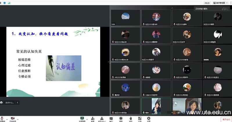杨珍用深入浅出的语言、详实的案例和丰富的图片带领学生们了解目前疫情防控新政策、疫情下常见的不良情绪、有效调适策略和积极心理学的相关理论。她结合大学生生活实际,从疫情常态化防控期间大学生对于亲密关系、学业、生活习惯、意义建构四个方面介绍了大学生常见心理问题及其应对。通过案例分析,杨珍为同学们讲解如何培养积极的生命价值观、建立理性认知,合理应对各类不良情绪,且对于使人焦虑的相关生活提出相应策略,促进心理发展,鼓励同学们努力追寻生命的意义。