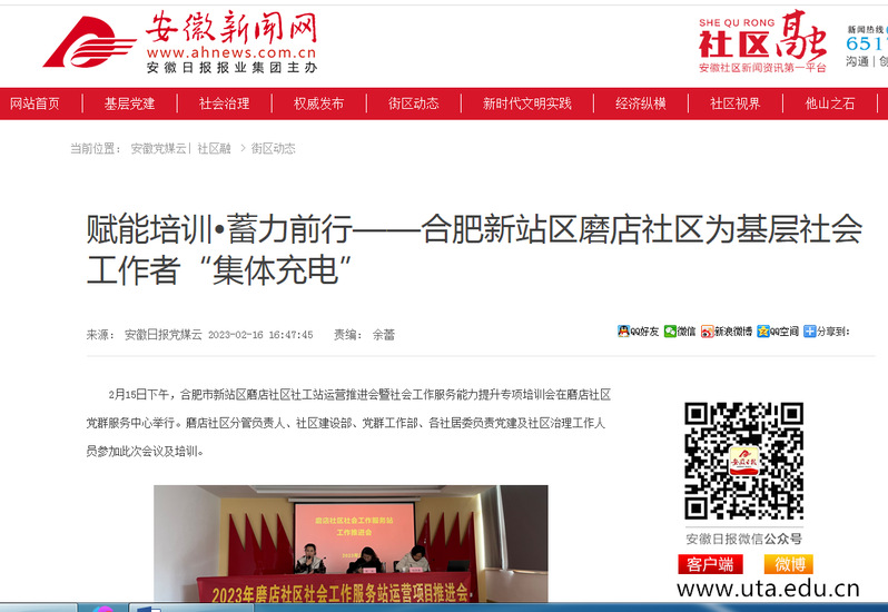 2月16日《安徽日报》新媒体客户端、《安徽新闻网》以“赋能培训•蓄力前行——合肥新站区磨店社区为基层社会工作者‘集体充电’”为主题,对“安职院”公共管理学院专业教师朱凤丽受邀为社区基层工作者开展培训工作进行报道。