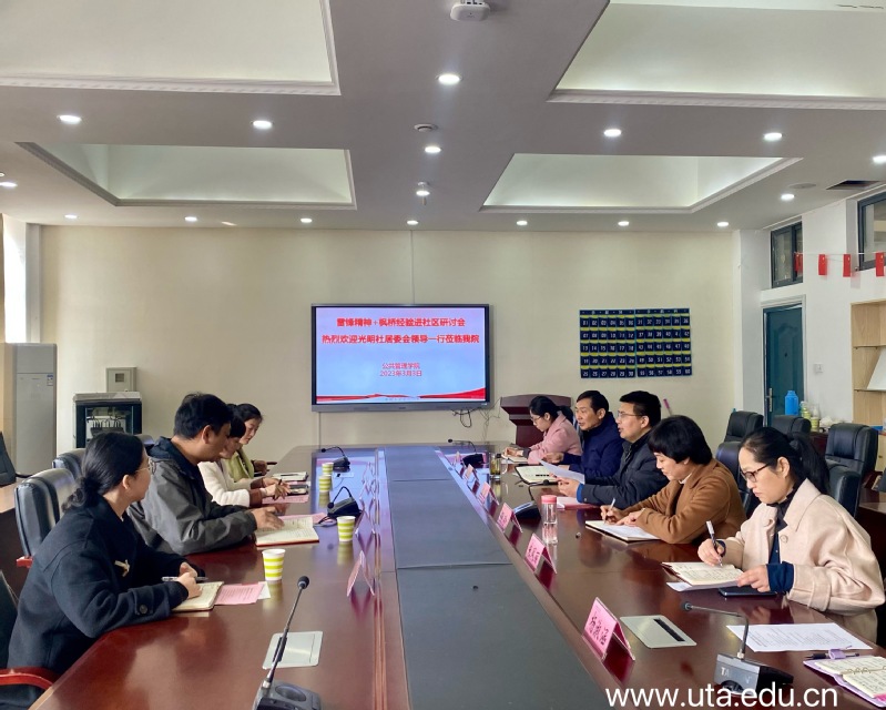 3月3日上午,公共管理学院举办雷锋精神融入基层社区治理研讨会,磨店社区光明社居委党总支书记宇健、社居委委员葛玉香、社区工作者彭宇倩、海星社会工作中心主任李家倩应邀出席研讨会,学院党政负责人闫冰、张祎、杨珍,社区与公益管理教研室主任朱凤丽、心理健康教育中心萧潇老师、党政秘书杨淑涵等参加会议。