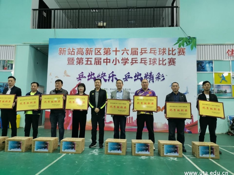 (校工会通讯员 贾亮亮)金秋送爽,丹桂飘香。10月17、18日,新站高新区第十六届乒乓球比赛在园上园小学顺利举行,校长孙敬华,党委副书记、纪委书记郭淼带领我校乒乓球队积极参加比赛,全体队员的努力拼搏、团结协作,经过两天激烈奋战,取得了优异的成绩。
