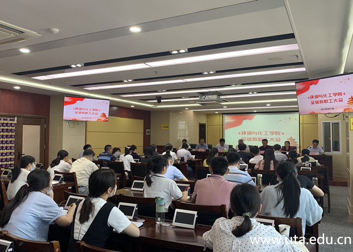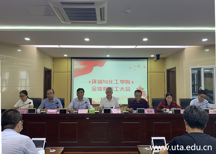 8月31上午环境与化工学院在行政楼九楼视频会议室召开新学期全体教职工大会党委副书记、纪委书记郭淼校工会主席陈纲到会督查指导,学院党总支书记陈国玖、院长方向红、副院长郝建文及全体教职工参加会议。会议由陈国玖主持。