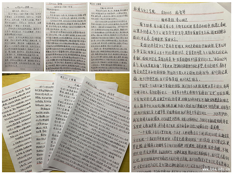 笔尖流神韵,纸本现真情。按照学院要求,团总支组织开展“我为烈士护忠魂”主题征文比赛,以纪念烈士、崇敬英雄、传承英烈精神为主线,结合学生自身所学、所见、所闻、所思,表达对革命先烈的追思怀念、对新时代英雄的崇敬学习,通过征文的形式,唤起学生缅怀烈士的热情,掀起赞扬烈士的狂潮,引导学生以建设国家为自己责无旁贷的使命与任务,笔写情感,以文寄思,激发起同学们的爱国热情。短短的几天时间里,团总支陆续收到很多征文,文章深切的表达对革命英雄的赞扬之情,表现出当代大学生的爱国意识和砥砺奋进的热情。(环境与化工学院 程银林)