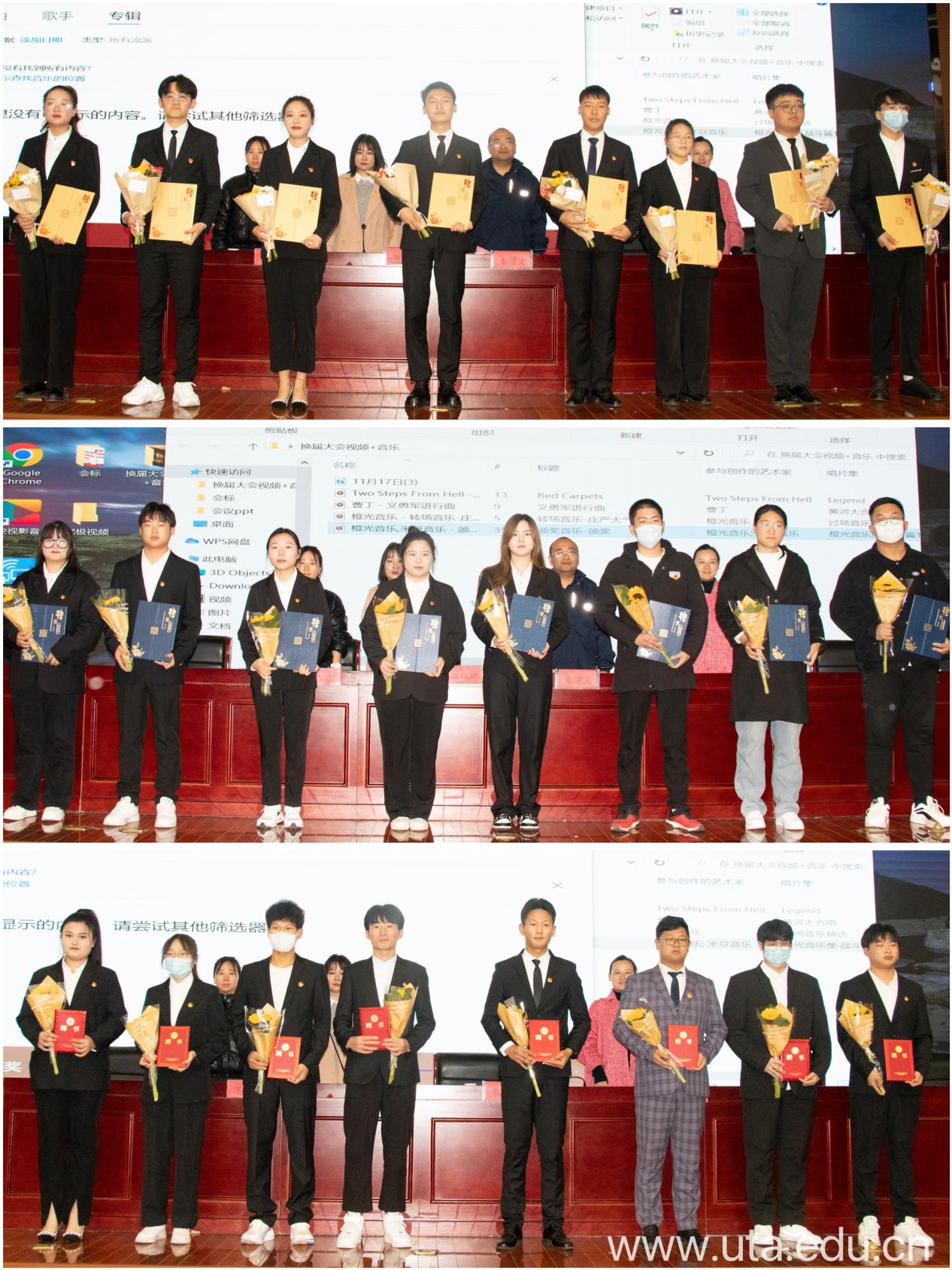 在道路上磨砺,在奋斗中茁壮。2020级学生会执行主席邹可新和2020级团总支文艺部部长、文艺团团长许霄睿做作学生会年度工作总结报告,2021级团总支副书记李小杰和2021级团总支文艺部部长黄帅作就职发言。每一次发言后都引起台下雷鸣般的掌声,一份誓言,一腔热血,一种责任,都将谱写成绚丽多彩的无悔青春。