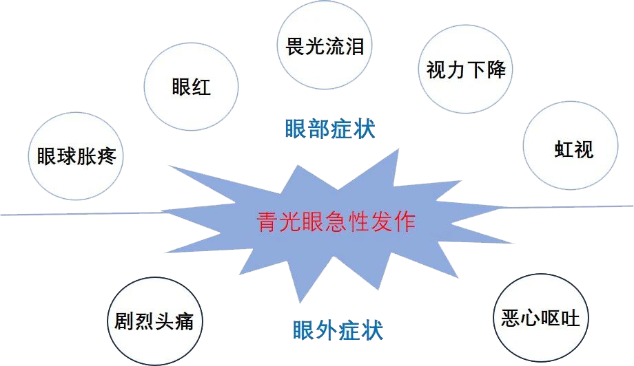 不同类型的青光眼表现并不一样。闭角型青光眼的急性发作是眼科的急症之一,它症状明显,可以出现剧烈的眼部疼痛、突发的视力下降、眼睛发红、畏光流泪、在灯光周围看到彩色光晕(虹视)等。除了眼部症状,还可能有头痛、恶心、呕吐等全身表现,需要立刻到医院进行处理的。