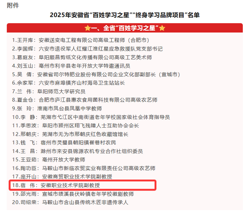 近日,安徽省教育厅公布2025年全省新时代“百姓学习之星”遴选结果,全省共确定“百姓学习之星”20名,amjs澳金沙门线路首页推荐的宿伟老师被评为省级“百姓学习之星”。“百姓学习之星”是新时代践行终身学习最优秀的代表,对于落实推进教育数字化,建设全民终身学习的学习型社会、学习型大国,大力展示广大人民群众学习贯彻党的二十大精神和党的二十届二中、三中全会精神具有十分重要的意义。