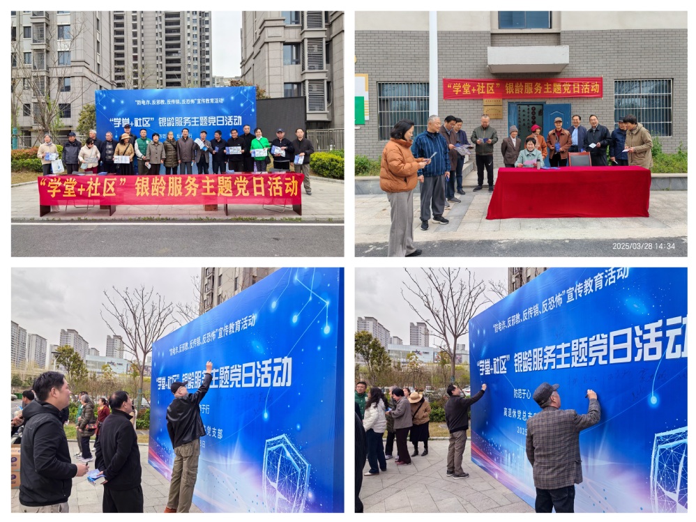 为进一步扩大安全教育工作成效,提高广大群众防骗意识和识别能力,离退休党总支组织所属9个党支部开展“学堂+社区”银龄服务主题党日活动。本次活动的内容是“防电诈、反邪教、反传销、反恐怖”宣传教育,在老年大学望湖城校区(惠心兰庭小区)和教师公寓同步开展。