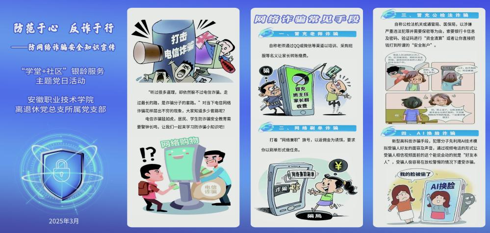 活动中,退休职工党员通过案例宣讲、发放反诈宣传资料、微信群发布电子宣传资料等方式,深入老年大学、社区等区域,从常见的网络刷单诈骗、冒充公检法诈骗、AI换脸诈骗、冒充亲友诈骗等,详细解析电信网络诈骗的常见手法、特点和危害,并给出简单实用的防范建议,提醒大家提高警惕,时刻防范,守护好自己的“钱袋子”。