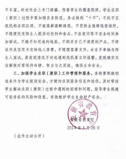 转发安徽省教育厅关于加强在校学生求职期间防骗防伤害教育工作的预警通知