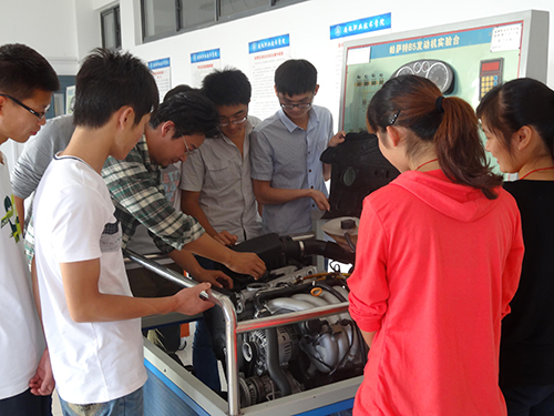 汽车故障诊断实训室,有1台帕萨特自动变速试验台,1台帕萨特B5发动机试验台(汽油),1台ABS防抱死系统试验台。在这里,学生通过自动变速器试验台了解变速器基本变速原理、基本档位及使用方法、常见故障设置以及处理方法、电路图等;通过汽油发动机试验台熟悉以汽油发动机总成及运行附件组成的发动机,该试验台可进行起动运行、加速、减速、故障检测与诊断、故障模拟与排除等工况的实际操作,真实展示汽车电喷汽油发动机结构与原理及工作过程;ABS防抱死系统试验台采用四通道的ABS调节回路,四轮单独调节,试验台的ABS系统能够正常运行,可模拟ABS系统的工作过程,模拟出有ABS和没ABS的区别,让学生学习ABS防抱死系统。