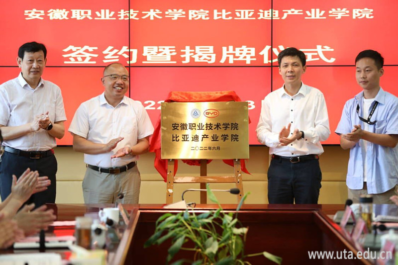 6月13日上午,amjs澳金沙门线路首页与比亚迪汽车工业有限公司在图文信息中心九楼会议室举行比亚迪产业学院签约暨揭牌仪式。长丰县县委书记李命山,长丰县政府副县长王丰,长丰县政府副县长、教体局局长陶程及长丰县县委办公室、长丰县人社局等部门领导莅临仪式。比亚迪汽车工业有限公司华东地区人力资源部合肥基地负责人赵鹏勃,比亚迪汽车工业有限公司合肥基地人力招聘主管李天奇,院党委书记李方泽,院党委副书记、院长孙敬华等党政领导班子全体成员,相关职能部门负责人、汽车工程学院党政负责人及部分骨干教师出席仪式。仪式由校党委委员、副院长张智清主持。