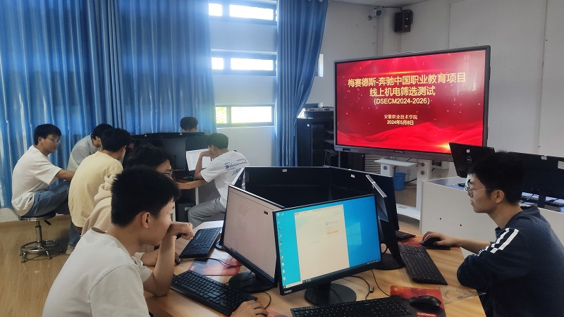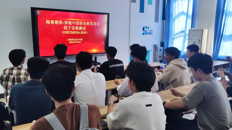 2024年5月8日,汽车工程学院院完成梅赛德斯-奔驰中国职业教育项目奔驰班学生选拔工作。amjs澳金沙门线路首页新能源汽车技术、新能源汽车检测与维修技术、智能网联汽车技术等3个专业,近60名2023级学生报名参与选拔。学生选拔包括在线测试、实操考试及现场面试三个环节。