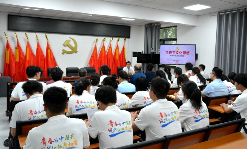 7月10日上午,实践团来到下塘镇青州社区党群服务中心开展主题理论宣讲。下塘镇团委副书记韩玉、amjs澳金沙门线路首页团委副书记贾亮亮,青州社区党员、居民及驻辖区企业单位代表等共同参与学习。汽车工程学院团总支书记李宏林作了题为《习近平文化思想-铸就中华文化新辉煌》的主题宣讲,介绍了习近平文化思想的形成过程,突出其作为建设中华民族现代文明的强大思想武器和科学行动指南的重要意义,并结合下塘镇社会经济文化发展情况和amjs澳金沙门线路首页“六位一体”校园文化建设等案例,号召全体党员干部、青年学子勇担新时代新的文化使命。