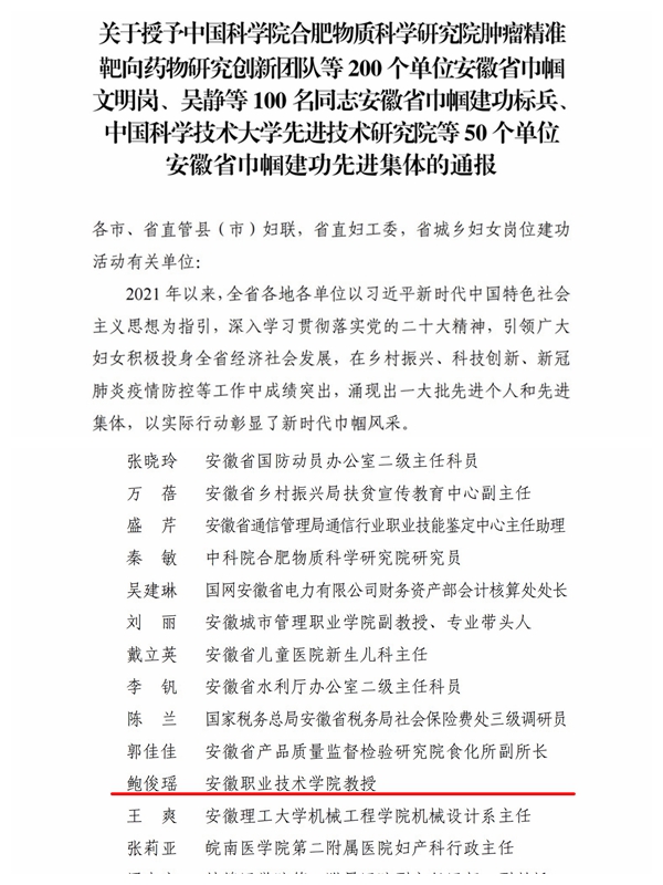 (人事处通讯员 汪梅紫)为充分发挥典型的示范引领作用,进一步激发广大妇女立足岗位、争先争优,勇于担当、无私奉献的积极性、主动性,在新时代新征程上作出新的更大贡献,据《关于授予中国科学院合肥物质科学研究院肿瘤精准靶向药物研究创新团队等200个单位安徽省巾帼文明岗、吴静等100名同志安徽省巾帼建功标兵、中国科学技术大学先进技术研究院等50个单位安徽省巾帼建功先进集体的通报》文件,安徽省妇联授予吴静等100名同志“安徽省巾帼建功标兵”称号,其中,amjs澳金沙门线路首页鲍俊瑶教授荣获“安徽省巾帼建功标兵”荣誉称号!