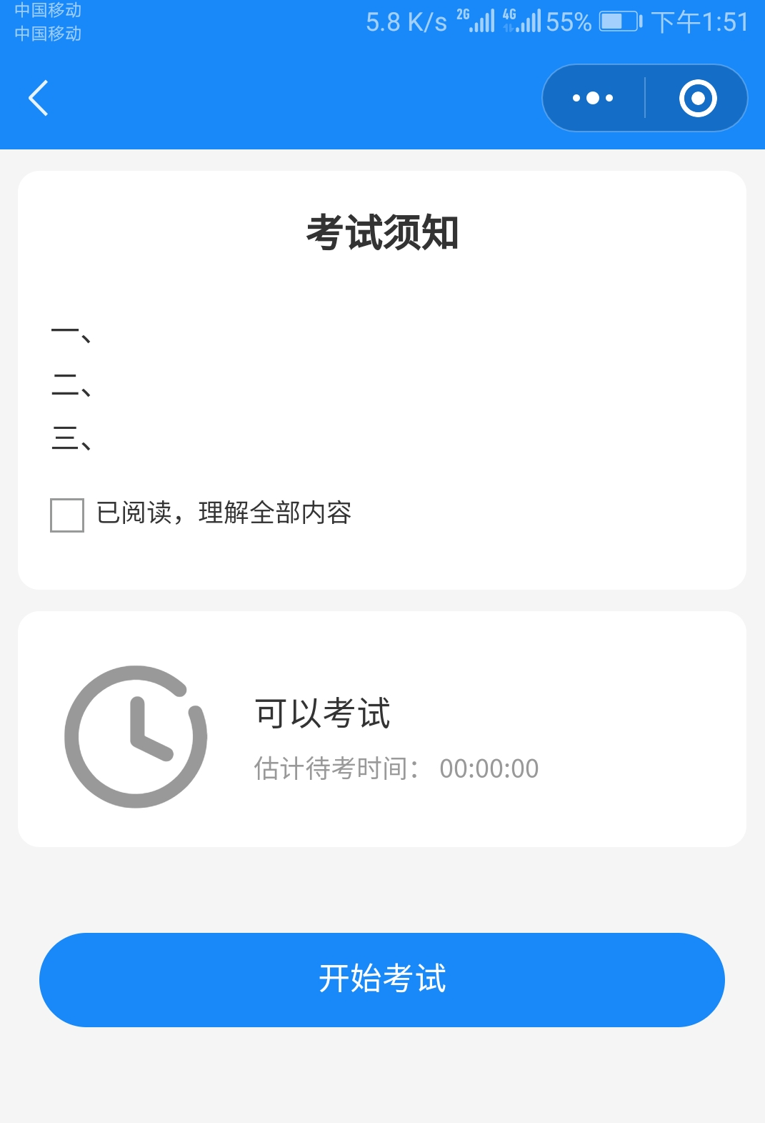 7、查看图7中考试须知,勾选“已阅读,理解全部内容”,当出现可以考试时,点击“开始考试”,进入图8所示界面;