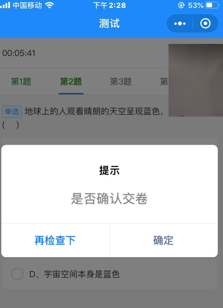10、答题结束后,点击“交卷”,会有相应的提示,如图9所示,点击“确定”;