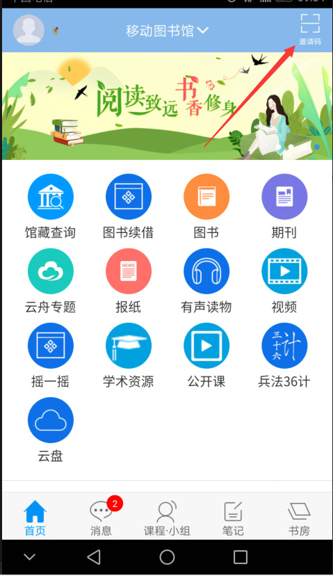 二、输入“学院/机构码”、“学号”、“密码”。成功登录后,点击“移动图书馆”,进入移动图书馆页面。