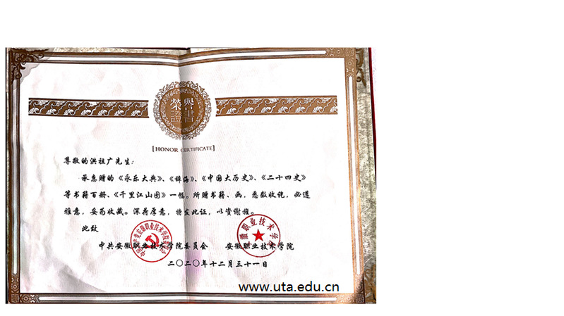 交谈中,洪祖广拉着同志们的手一再叮嘱,要深入学习贯彻中共十九届五中全会精神,按照习近平总书记对职业技术人才培养工作的要求,为培养更多更好的技术人才作出新贡献。言辞之中既饱含了对学院建设与发展的殷切期望,也是对事业继承者郑重交付的嘱托。郭淼和陈行为洪祖广先生颁发了捐赠荣誉证书,致以诚挚的感谢和节日的问候,并表示一定要用好这些珍贵的书籍。