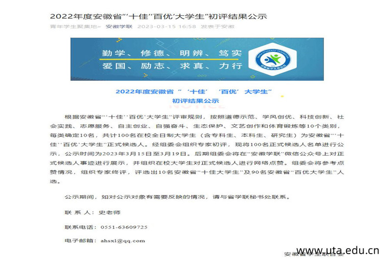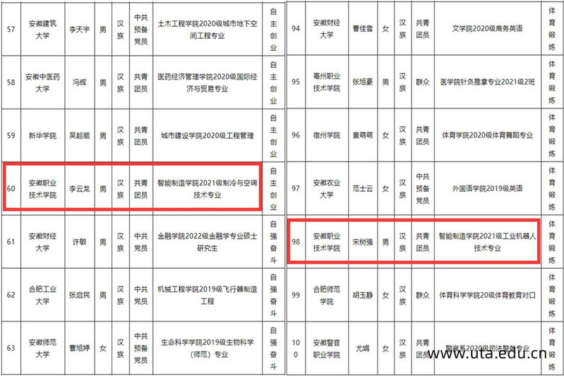 近年来,学院积极为广大学生搭建成长成才平台,切实服务广大学生发展需求,不断丰富校园文化生活,坚持把典型推荐、培养和宣传作为创先争优的重要载体和有效抓手,形成了一系列品牌特色活动,着力塑造了安职学子勤奋好学、刻苦耐劳、自立自强、追求卓越的优良品质,培养出一大批励志成才、争创一流、勇于创新、甘于奉献的有为青年,涌现出“中国大学生自强之星”“安徽省大学生年度人物”、安徽省“‘十佳’‘百优’大学生”等优秀个人,受到广泛好评。学院团委将以此为契机,进一步发挥先进典型的示范、激励、带动和辐射作用,激励更多学子奋勇争先、再创佳绩,为推动学院高质量发展贡献新的更大的力量。