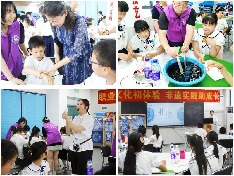 随后,小朋友们来到至正楼实训室,现代服装学院“青衿萤火”非遗宣讲团成员李天姿同学为小朋友们介绍了非遗扎染的历史及制作过程,让同学们亲身体会到扎染之美。在金隽等老师的指导下,小朋友们开始实际操作,将捆扎、折叠、扎结等方法运用到自己的作品中,充分发挥想象力,自主创作,一件件充满光晕感且特色迥异的扎染作品完美呈现出来。陈淑臻老师带领小朋友们编制了中国结手链,让他们在实践中感悟中华优秀传统文化的现代魅力。