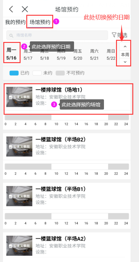 篮球馆分半场预约,如若需要预约整场,请预约两个半场。(需要预约篮球馆全场时,不能错开场地和时间预约)