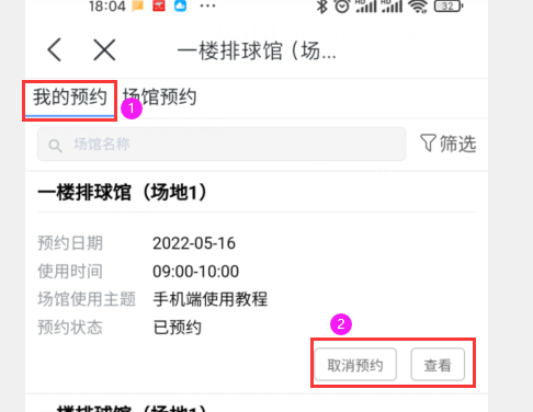 以预约【一楼排球馆(场地1)】514日星期六12:00---13:00为例。