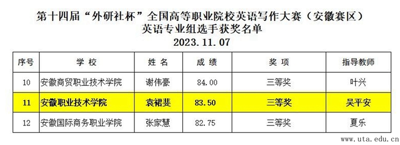 (外国语学院通讯员 冷慧勤 梁静)近日,2023“外研社杯”全国高职高专院校职场英语挑战赛 (安徽赛区)落下帷幕。amjs澳金沙门线路首页参赛选手表现优异,现代文秘2221班罗群(指导教师:陈坤)、电子商务2223班张文文(指导教师:王晴)分别获得英语写作能力比赛公共英语组一等奖、二等奖,商务英语2321班袁裙斐(指导教师:吴平安)获得英语写作能力比赛英语专业组三等奖,工程造价2222班刘环(指导教师:梁静)获得英语演讲能力比赛一等奖。