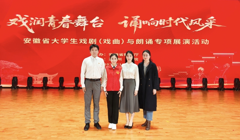 11月21日,由安徽省教育厅主办、滁州学院承办的全省大学生戏剧(戏曲)与朗诵专项展演活动在滁州学院会峰校区圆满落幕。本次活动以“戏润青春舞台,诵响时代风采”为主题,汇聚安徽大学、安徽师范大学等11所高校的11个优秀作品同台绽放,我校文化与旅游学院胡子童、胡俊怡、李袁慧三位同学带来的朗诵作品《以你为镜》,作为获评一等奖的优质佳作入选现场展演,尽显我校学子的艺术风采与青春担当。