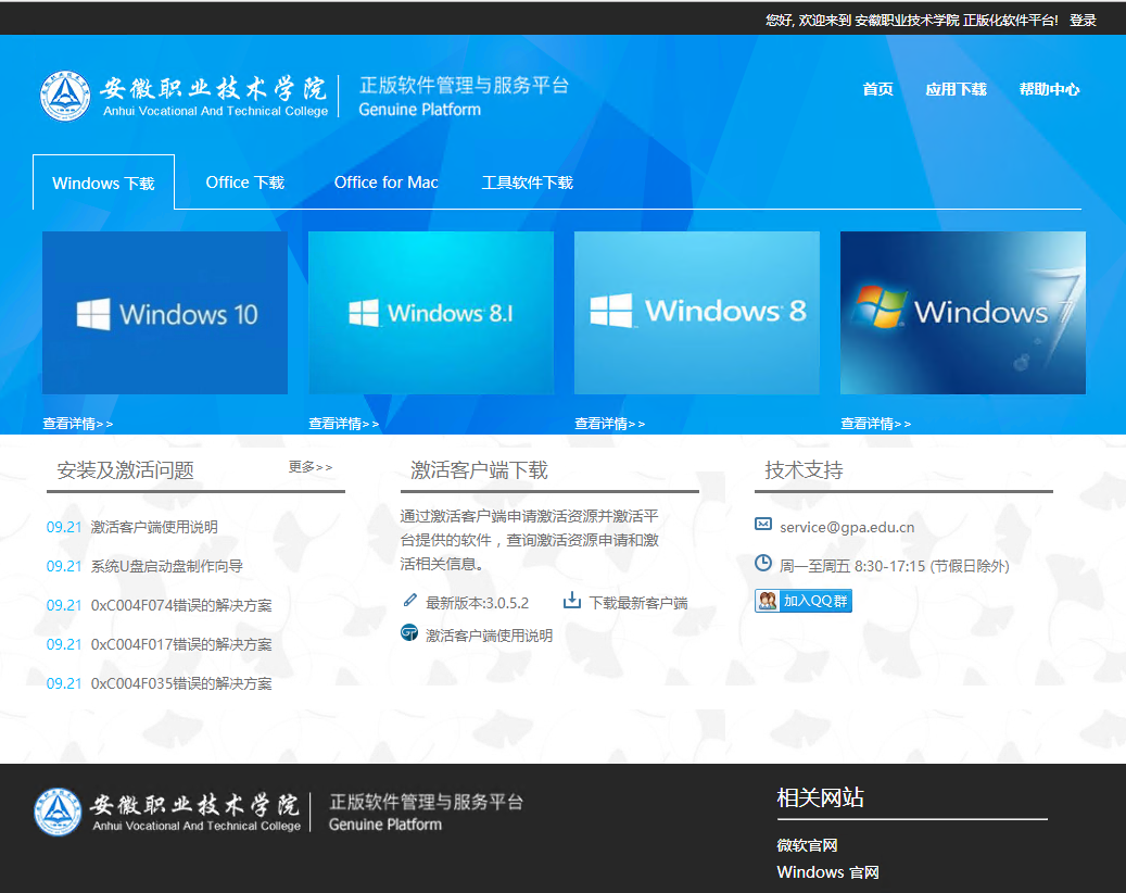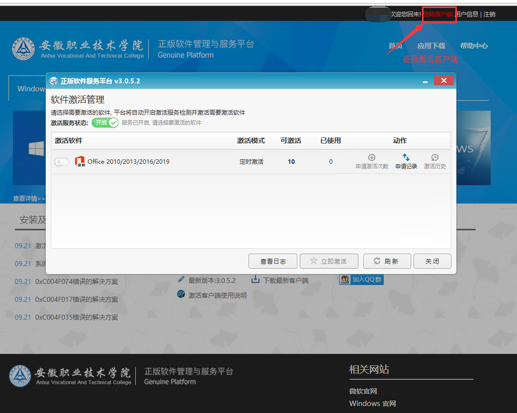 1) 登录智慧校园点击进入微软正版化平台,点击页面右下角的“下载最新激活客户端”链接
