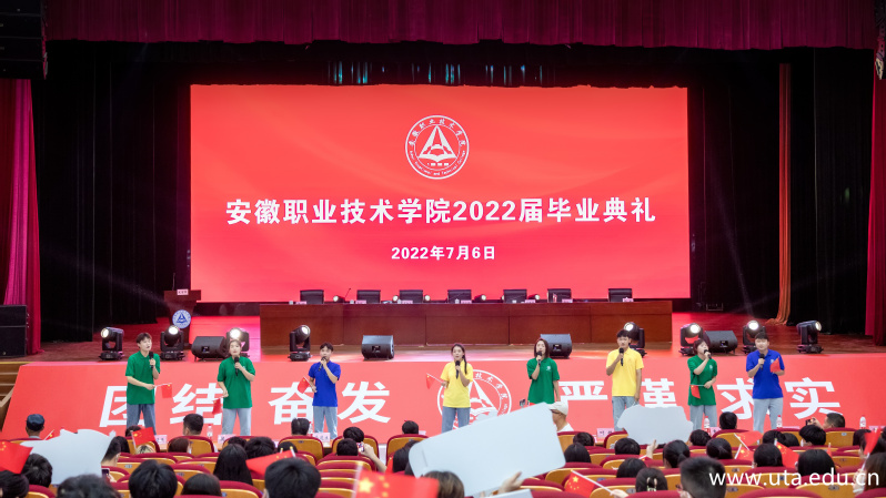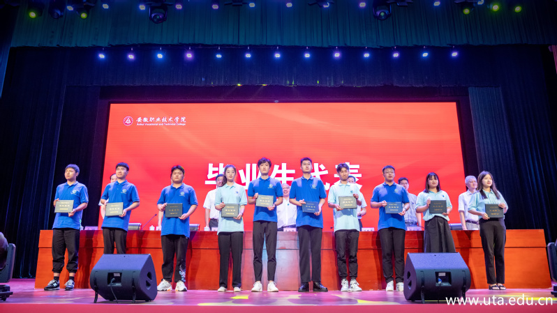 毕业典礼在庄严的国歌声中拉开帷幕,全场师生齐唱国歌,共同感受这一庄重的时刻。党委委员、纪委书记李荣富宣读《关于表彰2022年安徽省普通高校优秀毕业生的决定》,学院领导为2022届优秀毕业生代表颁发荣誉证书。党委委员、副院长杨林国宣读《关于准予2022届学生毕业的决定》,学院领导为2022届毕业生代表颁发毕业证书。