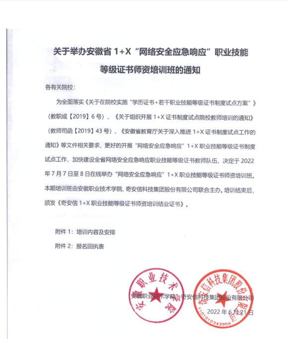 关于举办安徽省1+X“网络安全应急响应”职业技能 等级证书师资培训班的通知