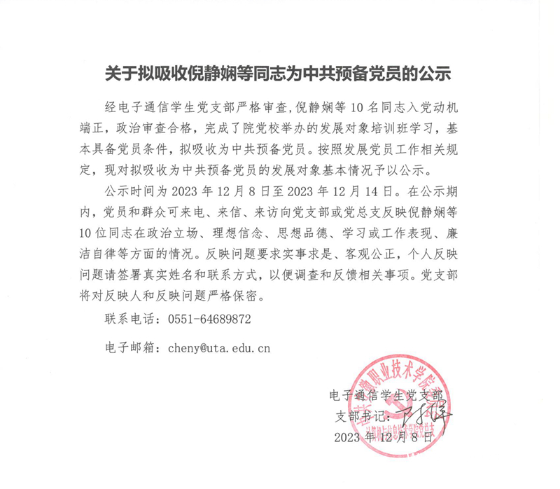 公示时间为2023128日至20231214日。在公示期内,党员和群众可来电、来信、来访向党支部或党总支反映倪静娴等18位同志在政治立场、理想信念、思想品德、学习或工作表现、廉洁自律等方面的情况反映问题要求实事求是客观公正,个人反映问题请签署真实姓名和联系方式,以便调查和反馈相关事项。党支部将对反映人和反映问题严格保密。