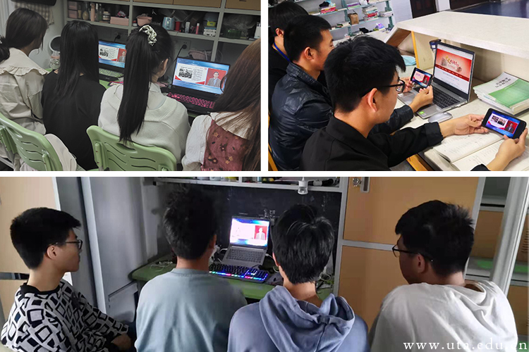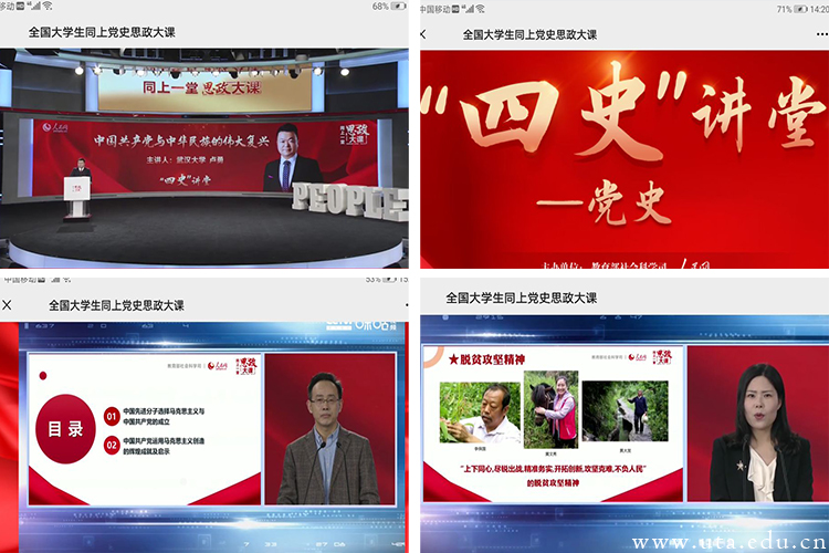 在“思政大课”即将开始前,同学们早早地进入了“人民网”微信公众号,等待上课的开始。根据周末的实际情况,本次“同上‘四史’思政大课”采用宿舍、教室集中收看、网络自行收看的方式进行。师生们认真收听了北京师范大学赵朝峰、武汉大学卢勇、南京航空航天大学何畏三位名师有关“马克思主义与中国共产党的百年辉煌、中华民族伟大复兴、中国革命精神”的精彩“党史”授课。