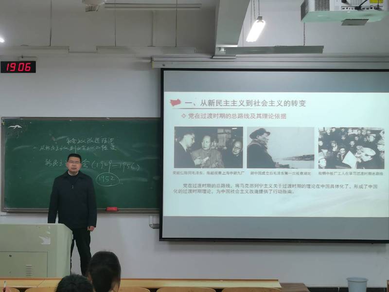 闫冰使用图文并茂、理论和实际相结合的方式讲述了----新民主主义社会是一个过渡性的社会、党在过渡时期的总路线、适合中国特点的社会主义改造道路、社会主义改造的历史经验等主要内容。