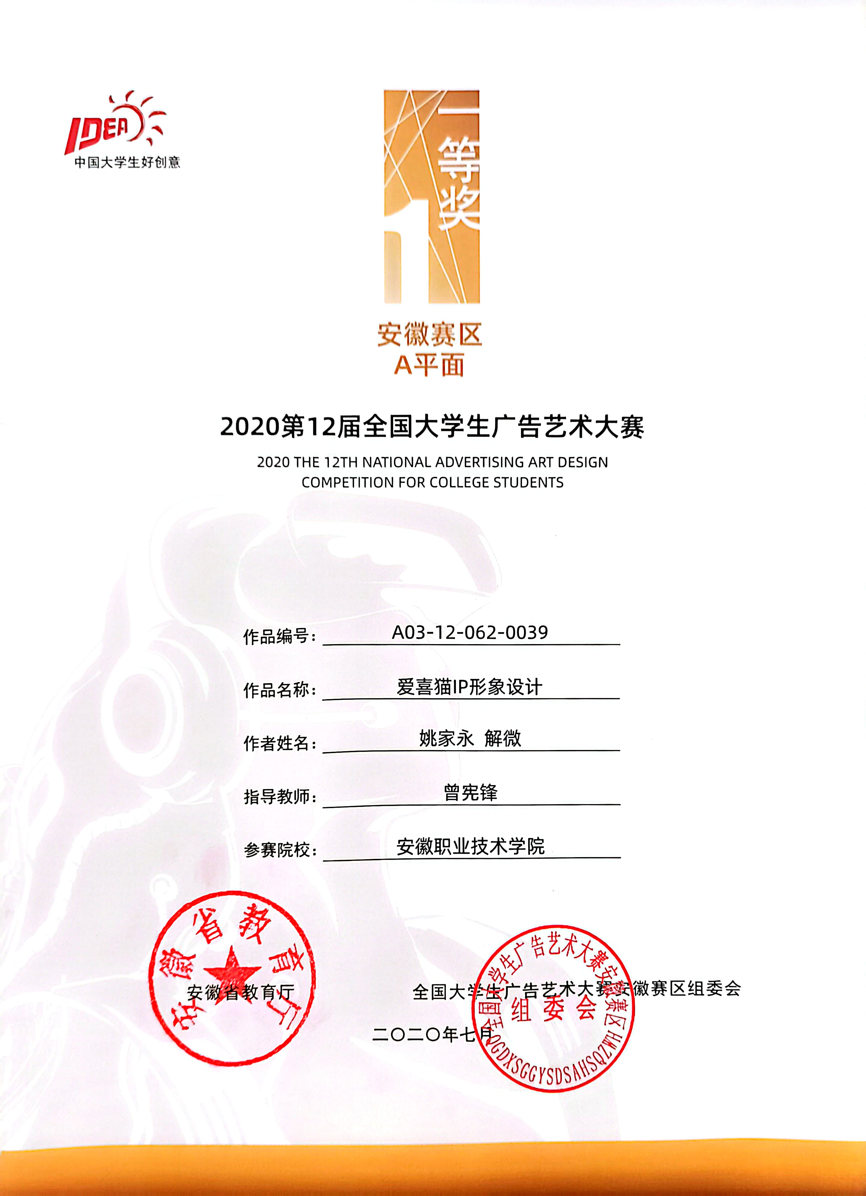 全国大学生广告艺术大赛安徽赛区平面类一等奖(如《开山老物:生活“酷”旅行,装起全世界》《玄冬之约逐岁东方》等)。