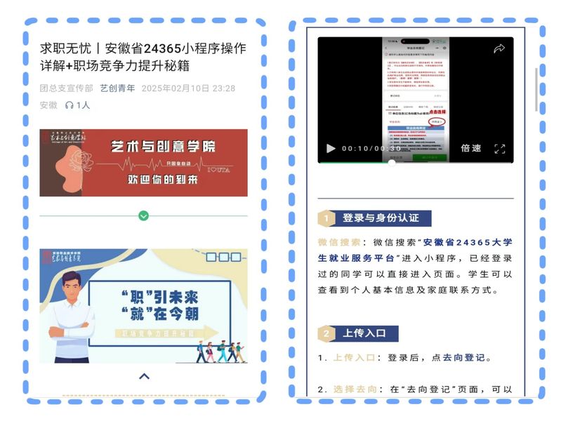 为帮助学生更好地使用安徽省24365大学生就业服务平台,学院精心制作《安徽省24365小程序操作详解+职场竞争力提升秘籍》公众号推文,详细介绍了小程序的功能、操作步骤及常见问题解答,并提供了实用的职场技巧,向毕业生精准推送。