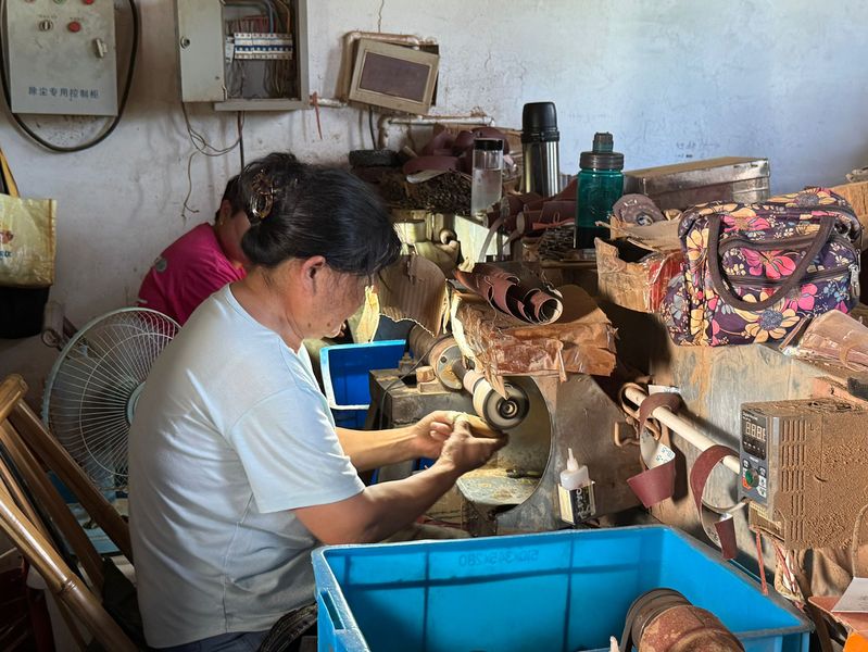 紧接着团队走进木梳制作工厂,机器的轰鸣声与檀木清香交织。车间里,胡厂长握着打磨工具,布满厚茧的手掌稳稳推进木料,木屑纷飞间,梳齿的弧度逐渐成型。他身旁,经验丰富的匠人默契配合,从开齿、修型到抛光,二十八道工序环环相扣。这些“守艺人” 手掌上的茧子,是岁月镌刻的勋章,不仅记录着与木头、工具相伴的日夜,更见证着传统技艺在现代时光里的温柔蜕变。