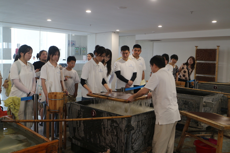 随后,实践团队前往宣纸制作工坊,近距离观摩宣纸的制作过程。从青檀树皮和沙田稻草的浸泡、蒸煮、漂白,到打浆、捞纸、晒纸等上百道工序,每一步都凝聚着匠人们的心血和智慧。团队成员体验制作宣纸,跟随捞纸师傅们的动作,将竹帘在纸浆池中轻轻一舀、一摇、一荡,一张均匀薄透的湿纸便留在了竹帘上,蜕变为一张张薄透均匀的宣纸。这里不仅是宣纸文化的宝库,更是传承千年技艺的精神殿堂,仿佛随手便可触摸到历史与文化的脉搏。