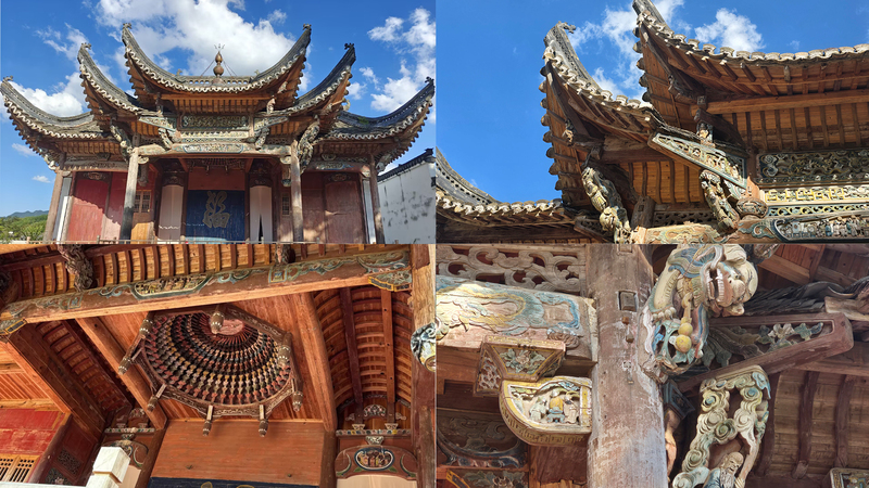 采访结束后,胡老师热情提议师生们参观园内的花戏楼,并深情讲述了这座古建筑在保护与修缮工作中所承载的艰辛与责任。花戏楼建筑平面呈“凸”字形布局,其木构屋面采用飞檐斗栱结构,檐下装饰着精美的深浮雕,题材为繁茂的花卉与福寿双全的寿星图案。戏台内部顶端,精巧的螺旋式藻井与色彩斑斓的彩绘平棊共同构筑出独特的声学空间,能显著增强演员唱腔的共鸣效果。整座建筑均以榫卯结构打造,浑然一体,至今保存着清光绪年间戏班留下的演出题记、彩绘戏曲脸谱等珍贵历史遗迹。