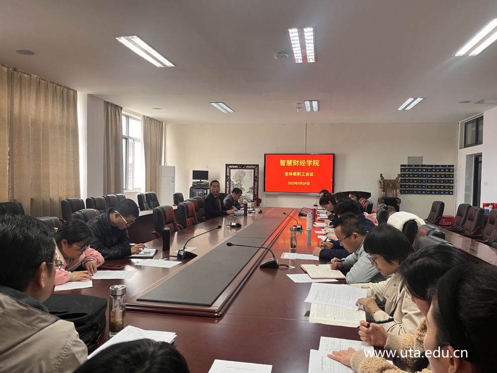 3月29日下午,智慧财经学院在经管楼307召开全体教职工大会。学院党政负责人和全体教职工参加了会议,会议由党总支副书记汪洪斌主持。