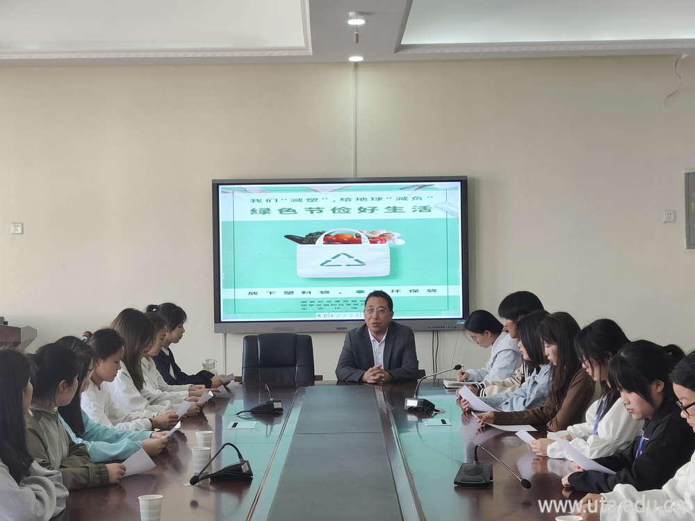 活动第一阶段在纺织楼403会议室展开。学院党总支负责人汪洪斌带领大家共同学习党的二十大报告中关于“推动绿色发展,促进人与自然和谐共生”的相关内容,并与大家共同观看视频《一个塑料袋降解需要多少年?》,了解一个塑料袋自然降解需要200年,并且严重污染土壤。汪洪斌指出,学校倡导大家“文明用餐在食堂”、“在校日行八千步”,一方面为了督促大家养成良好健康的生活习惯,另一方面就是出于保护环境、绿色低碳的考虑,尽量减少塑料垃圾的产生和能源的耗费。他号召同学们提升环保意识,争做生态文明理念的倡导者、传播者和践行者。