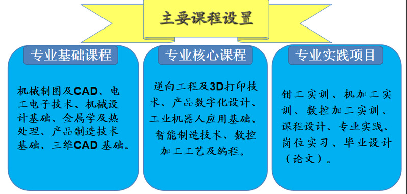 本专业主干课程包括:机械制图与CAD、机械设计基础、三维CAD基础、产品数字化设计、数控加工工艺及编程、产品制造技术基础、工业机器人应用基础、模具数字化设计与制造、智能制造生产控制技术等。核心课程实施“教、学、做”一体化,提升专业技术能同时配套开展课程设计、实验实训、岗位实习等专业综合实践课程。
