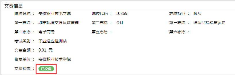考生应先查验报名信息和信息公告栏里学院发布的相关信息,确认无误后点击“线上缴费”按钮,点选上考试场次,根据自己的支付方式,点击“支付宝”或“微信”按钮,用手机支付宝或手机微信扫描页面上的支付二维码,待返回支付成功信息后,点击“确认”按钮,关闭支付二维码页框。然后请仔细查看交费信息,确认缴费状态为“已交费”。