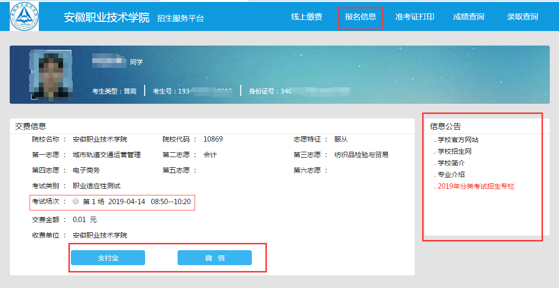 二、查看报名信息、学院相关信息及缴费