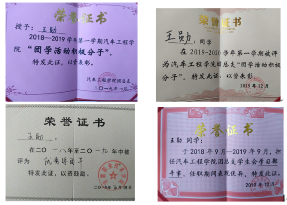 我是汽车工程学院奔驰1821班王勋,自信与奋进是我的青春代名词。我刻苦学习,成绩优异。大一担任班级团支书兼任学生会学习部干事,现担任班级团支书一职。从进入大学起,我就在各方面严格要求自己,以满腔的热情去对待工作和学习,在德、智、体、美、劳等方面提升自己的综合素质,我所在的班级大一和大二学年被评为校“优秀先进班级”和“五四红旗团支部”。大学期间生活简朴,努力学习,工作认真负责,严于律已,宽于待人,积极为班级作出贡献。